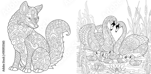 Coloring Page Adult Coloring Book Wild Fox Animal Swan Birds Couple For Valentines Or Family Day Vintage Greeting Card Antistress Freehand Sketch Collection With Doodle And Zentangle Elements Wall Mural Sybirko